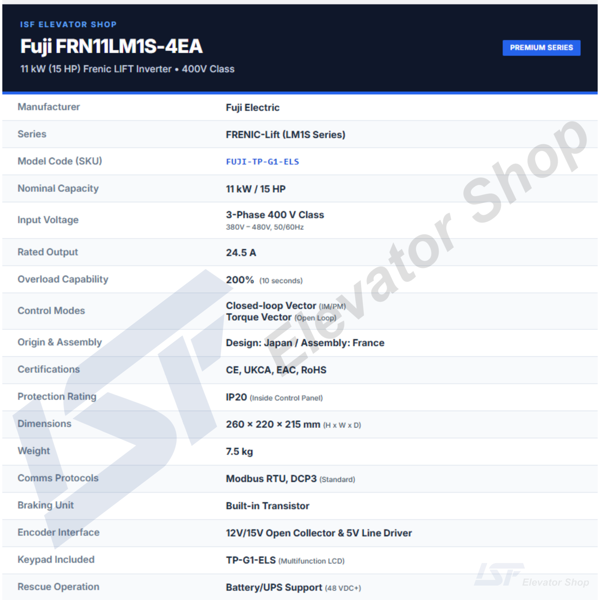 - Warranty & Supply: Supplied as the European-specified ‘EA’ model; comes with the Fuji Electric standard manufacturer’s warranty (TBD, confirm ISF Elevator Shop policy).